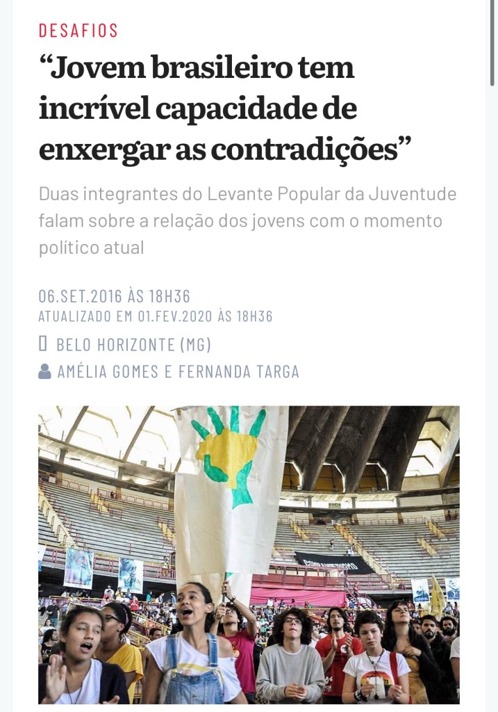 O Brasil de Fato MG entrevistou militantes do Levante Popular da Juventude. Julia Louzada é estudante de psicologia em Belo Horizonte e atua na frente estudantil da organização. Em outra frente de atuação, Mara Farias, organiza os jovens de Felipe Camarão, uma comunidade periférica de Natal, no Rio Grande do Norte. As duas compõem o movimento desde seu surgimento, em 2012.