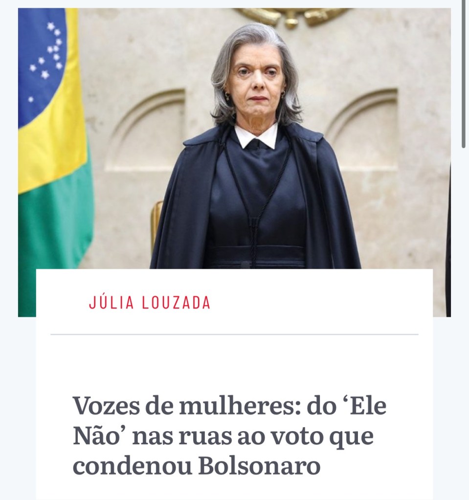 Escrevo estas palavras enquanto a ministra Cármen Lúcia argumenta no Supremo Tribunal Federal (STF) o seu voto, formando maioria pela condenação de Bolsonaro (PL). Enquanto a escuto, me atravessa a lembrança de todas nós em 2018, no grito coletivo do Ele Não, que hoje atravessou o mármore frio do tribunal.